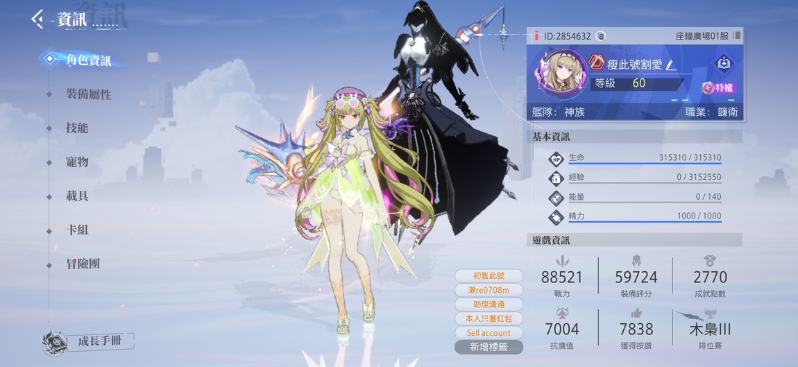 【60等】座鐘01 ,鐮衛。本命武器+23,戰力8w8 ,有興趣私聊價格甜甜