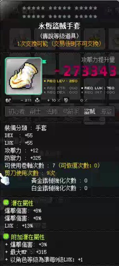 【永恆盜賊手套】雙傳 雙爆13%幸 附加3%爆傷 LUK每9等+1