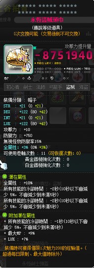 【永恆盜賊頭巾】雙傳 主潛 -4CD 10%全屬 附加傳說 -1CD 7%幸 永恆盜賊頭巾