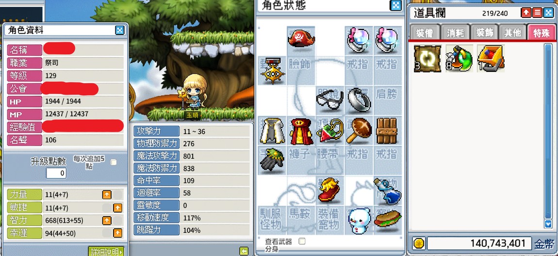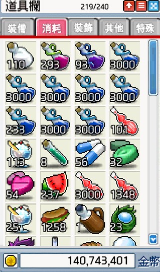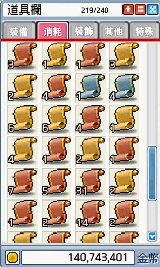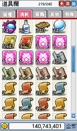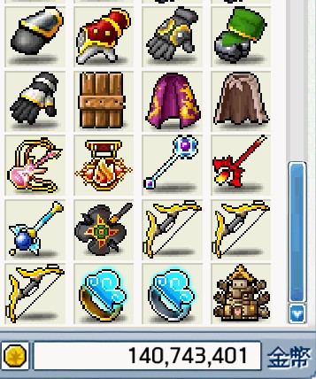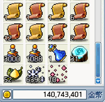 身上還有639雪+1.4億楓幣左右+30顆瞬移石/一堆雜裝/有價卷軸約有2-400雪/AP捲X3/355WC幣