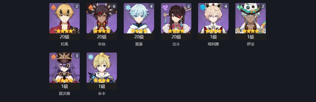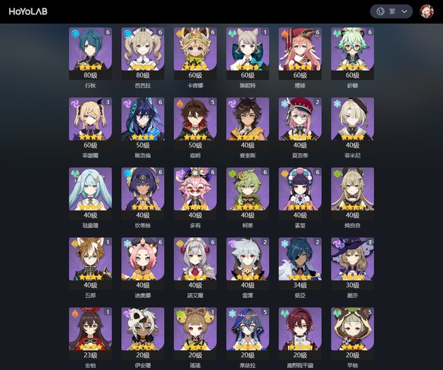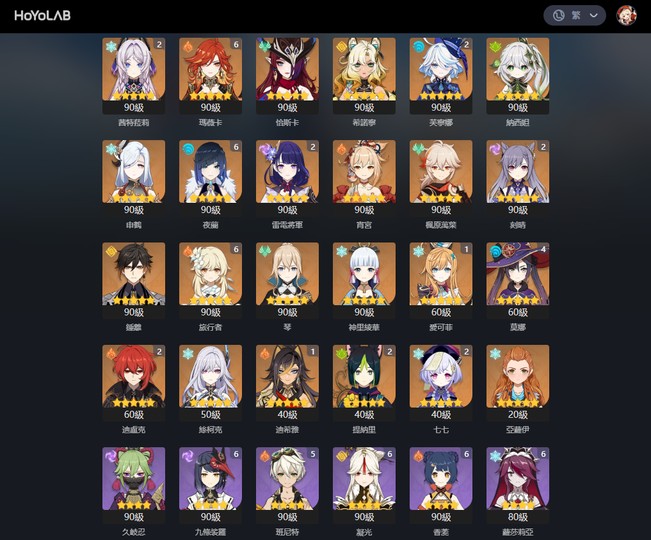 【女、60等、56金角、13金武】61火神、夜蘭、21茜特拉莉、10愛可菲、01絲柯克、菲林斯、2命水神、雷神