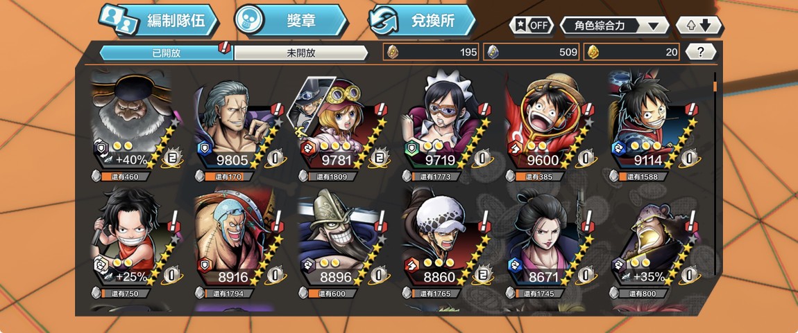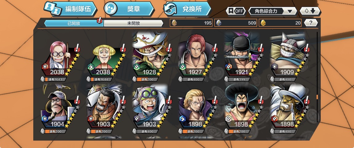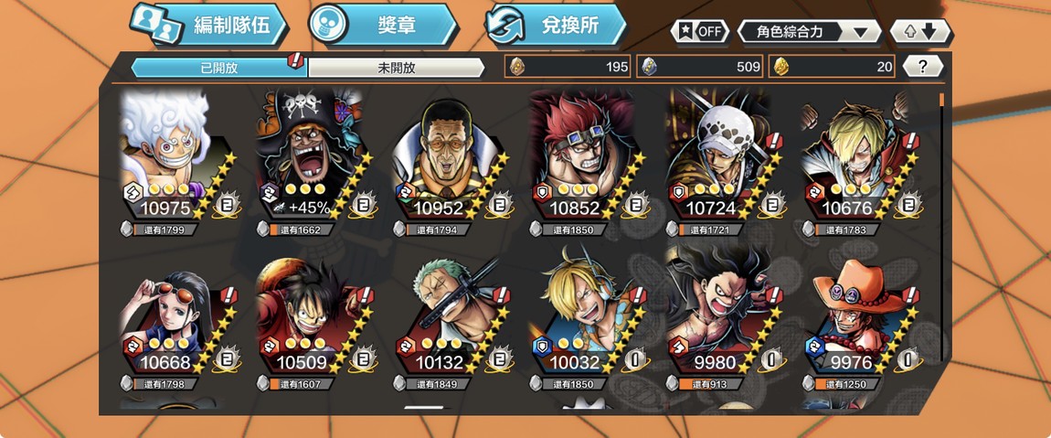 如圖,滿等黑鬍子、天叢黃猿、尼卡,未滿牛鬼、卡普、鬼索隆、劇場傑克。
