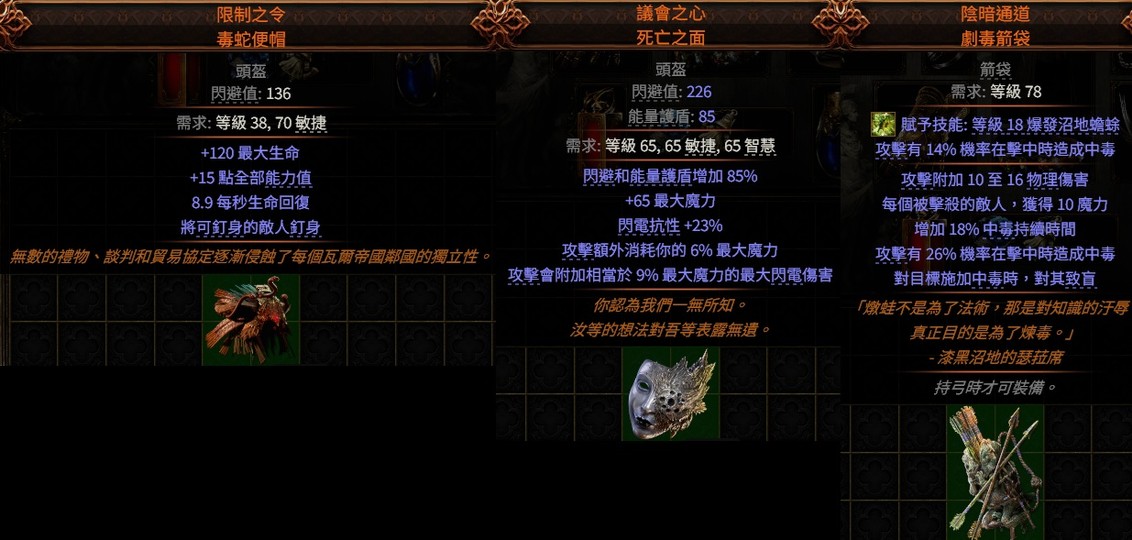 👌限制之令.毒蛇便帽釘身)議會之心.死亡之面閃電)陰暗通道.劇毒箭袋(致盲中毒