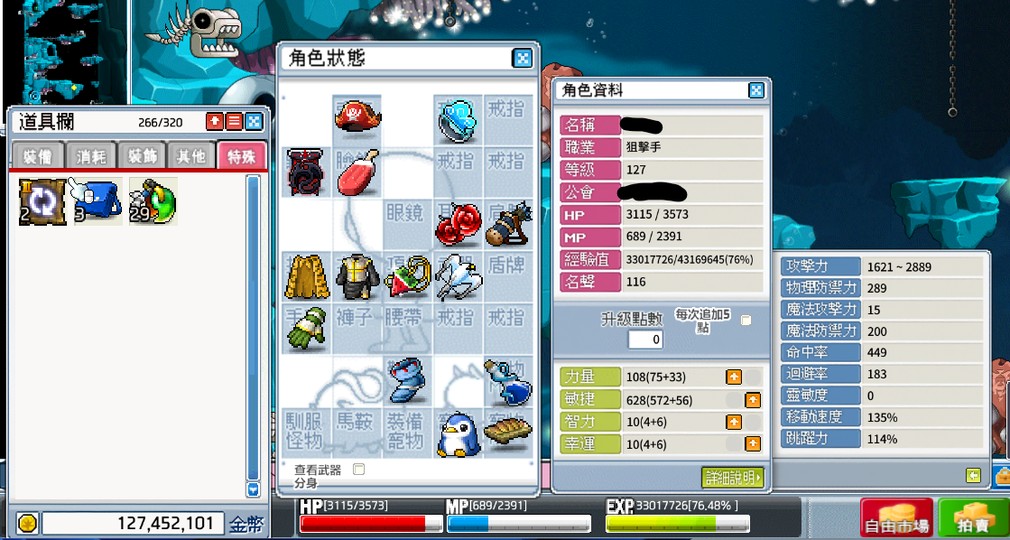 90帽 百等弩 青銅箭矢 乾表2813背包320格寵物123技永久寵物 洗完血 楓幣1億2千萬 13力虎披有未穿異界