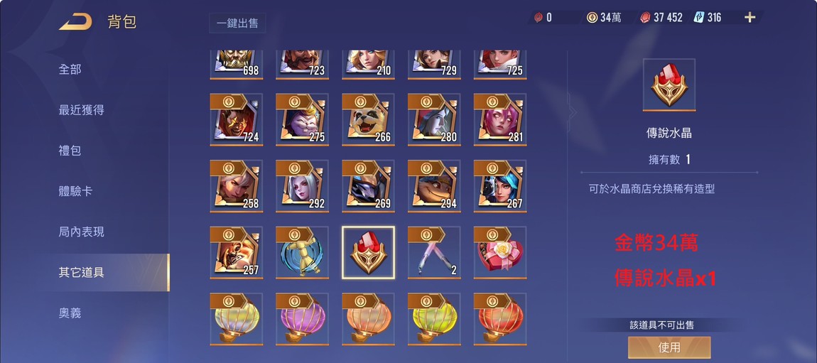全奧義、全服標、傳說水晶、金幣34萬、V10
