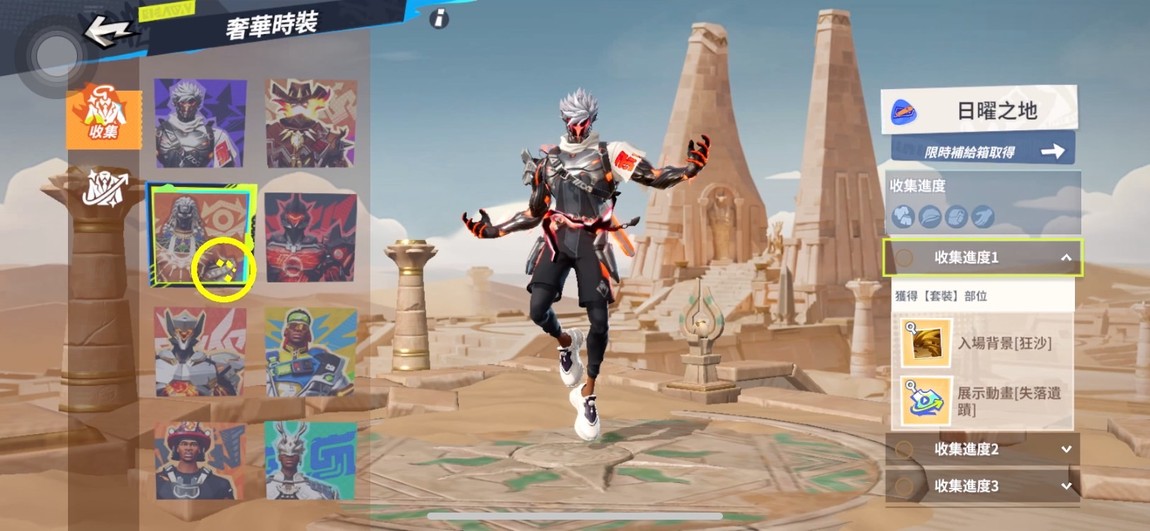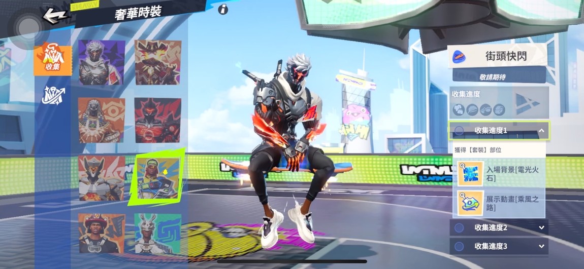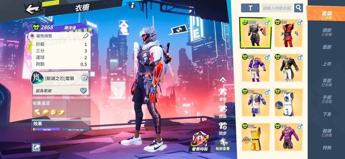 斷滅之刃整套、曼巴整套、實況轉播整套、嘉賓整套、豪傑整套、湖人隊服、勇士隊服、頭號玩家髮型、頭號玩家眼鏡、百萬先生套裝、百萬先生帽子、百萬先生墨鏡、百萬先生背包、珊瑚熱套裝、珊瑚熱背包、拳王手套、籃板牛手套