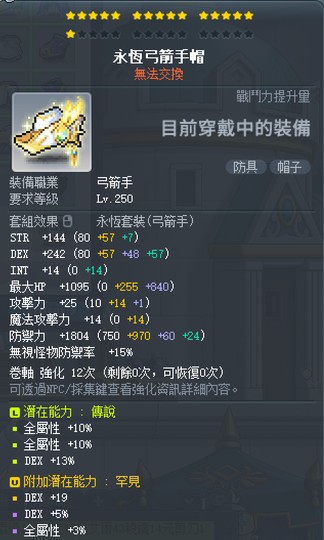 永恆弓箭手帽 無星無卷 33% 敏(20全) 附加 罕見 5敏+3敏 570t