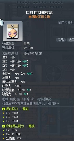 【口紅控制器標誌】雙傳口紅臉飾/主潛36%智/附加傳說雙排(8%智+5%全屬)/漆黑飾品