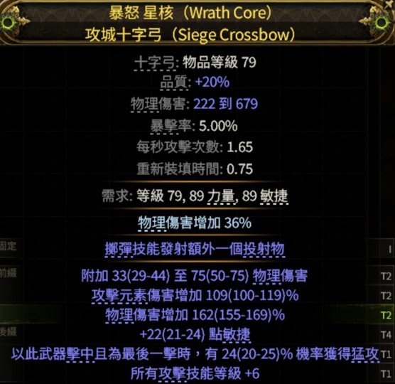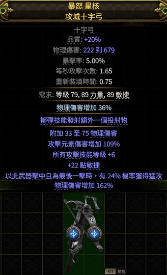 【十字弓、1投彈 攻城物理】爆炸十字弩 物理大傷679 109%元素傷 +6技能 猛攻 +1投射