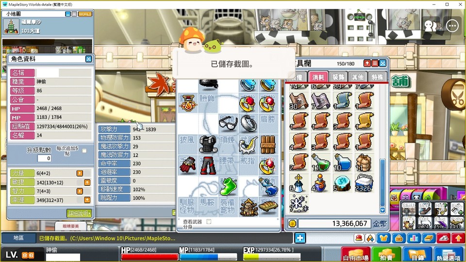 【87等、神偷_暗影神偷】如題 攻表1839 雪花7個 1300萬楓幣 不議價