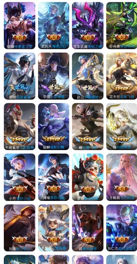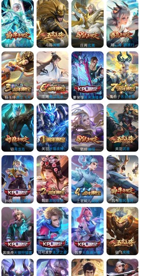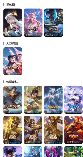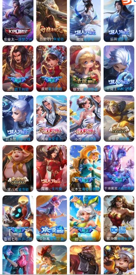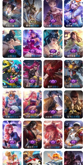 【限定皮膚】:姜子牙天穹之誓,狄仁傑陰陽師,趙云皇家上將,孫尚香薔薇戀人,魯班七號獅舞東方,魯班七號時之奇旅,莊周高山流水,高漸離死亡搖滾,阿軻迷蹤麗影,鍾無艷超時空戰士,羋月幻夜卜夢,周瑜赤蓮之焰,元歌云間偶戲,元歌無心,夏侯惇朔風刀,甄姬落雪蘭心,典韋岱宗,馬可波羅暗影游獵,馬可波羅山海玄木吟,狄仁傑魔術師,狄仁傑萬華元夜,達摩沙漠行僧,項羽海灘派對,老夫子醍醐杖,關羽武聖,程咬金演武奪籌,露娜一生所愛,劉邦奪寶奇兵,韓信傲雪梅槍,蘭陵王馴魔獵人,蘭陵王金庭之子,亞瑟潮玩騎士王,孫悟空至尊寶,孫悟空大聖娶親,孫悟空孫行者,后羿輝光之辰,后羿如夢令,后羿聖弓游俠,劉備百相守夢,張飛虎魄,李元芳匿光偵查者,李元芳云中旅人,虞姬啟明星使,鍾馗神跡守衛,鍾馗驅儺正儀,干將莫邪真愛魔法,雅典娜單詞大作戰,雅典娜黎明之約,鬼谷子原初探秘者,鬼谷子五穀豐年,黃忠火炮紳士,蘇烈千軍破陣,百里玄策原初追逐者,百里守約朱雀志,弈星混沌棋,夢奇頑趣,公孫離玉兔公主,沈夢溪大漠名商,沈夢溪匿光破解者,明世隱疑決卦,裴擒虎李小龍,裴擒虎擒濤扼浪,云中君纖云弄巧,盾山御鑾,豬八戒西部大鏢客,上官婉兒梁祝,嫦娥暖冬兔眠,曜山海蒼雷引,蒙犽狂想玩偶喵,魯班大師探海日誌,桑啟海鹽詩旅,夏洛特浮生妄,暃星界游俠,艾琳女武神,張良古海尋蹤,蒙犽百解令,蒙恬榮光聖徽,高漸離燃音魔法,妲己靈卜魔法,鬼谷子天穹祈燈,孫尚香乘龍問璇璣,呂布曦玄引,沈夢溪龍舞盛年,魯班七號蔬鄉物語