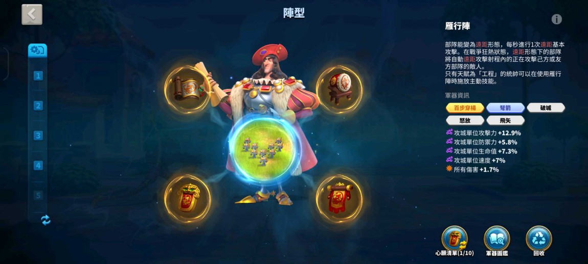 二隊弓兵(秦皇裝備軍器如圖)第二隊軍器普通裝備龍息一等無精練一隊遠程紫色專屬裝備+2金裝,軍器小成(素質35+)滿行軍速度高攻擊一四字