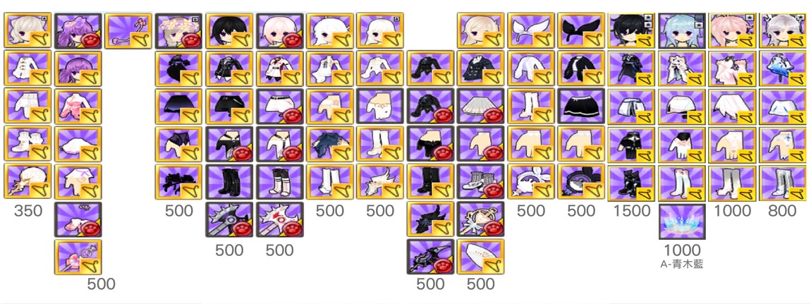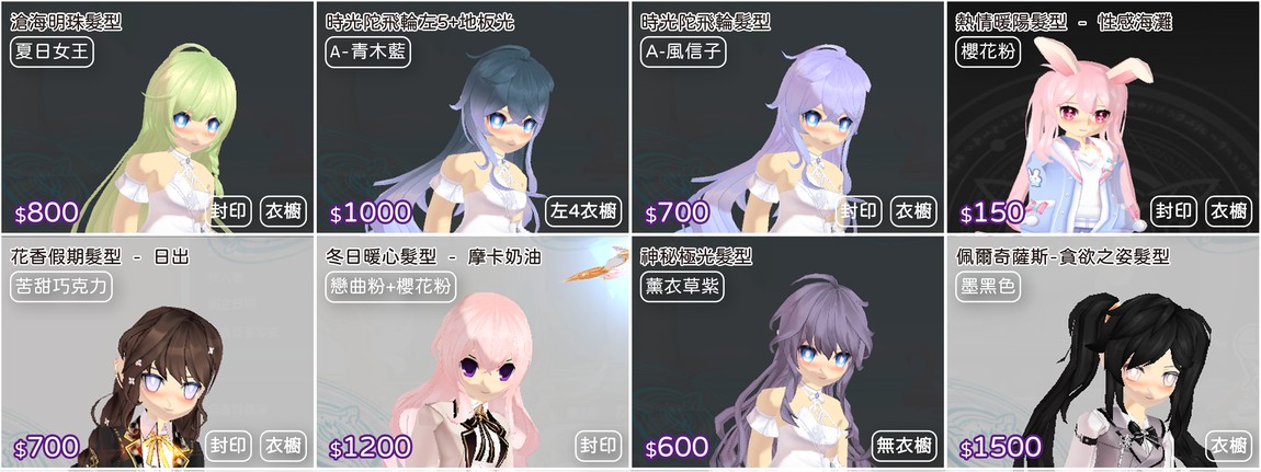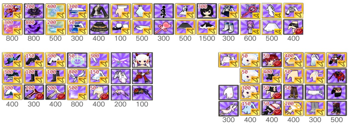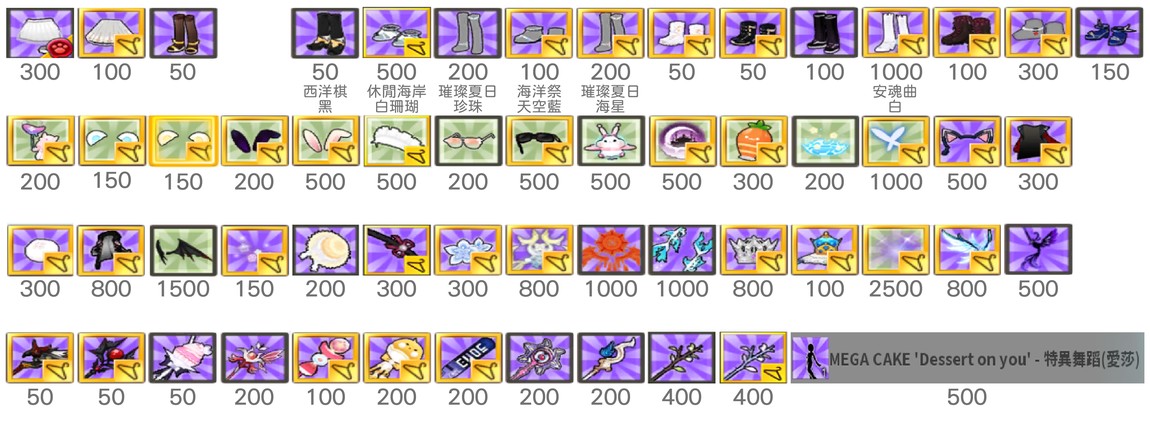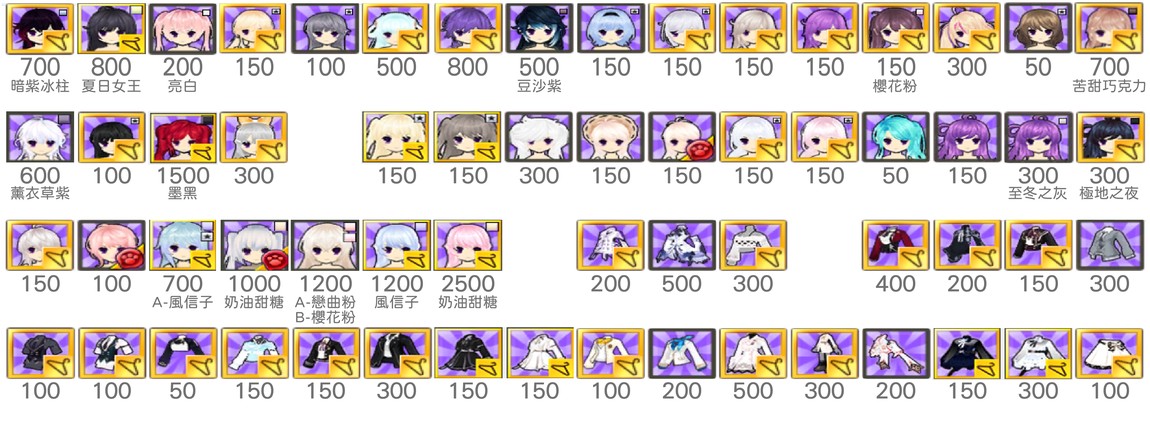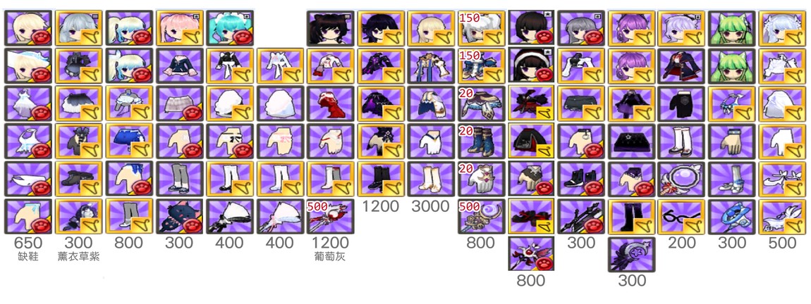 白封24/衣櫥髮型上下75/手鞋36/武器飾品105/連身150