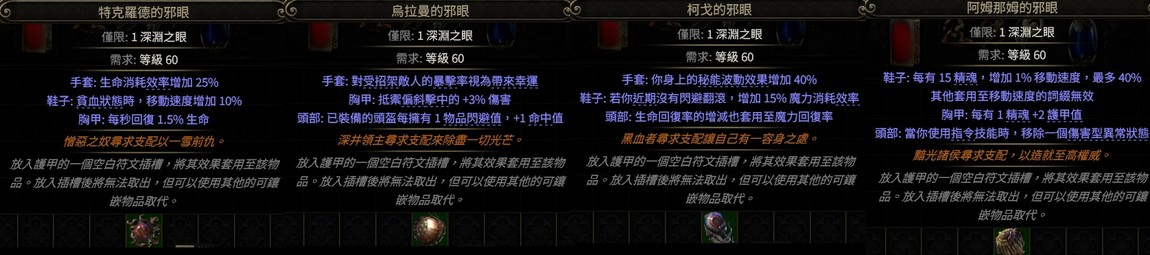 深淵之眼→頭胸甲鞋子手套(柯戈的邪眼秘能波動閃避翻滾、阿姆那姆的邪眼精魂移動速度