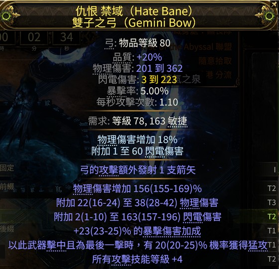 【弓、雙子之弓】物理362 閃電傷223 猛攻 +4 技能等級 23爆傷 銳眼閃電箭