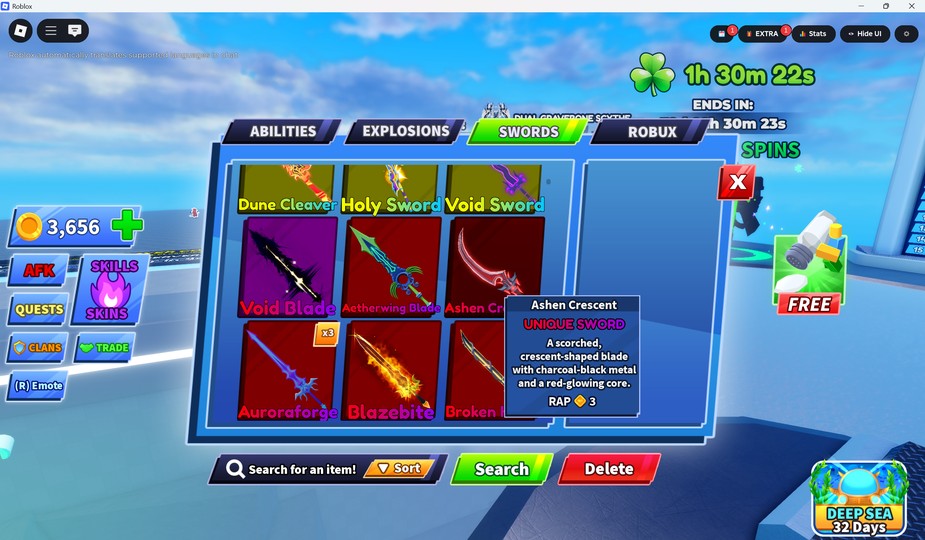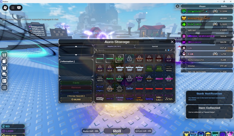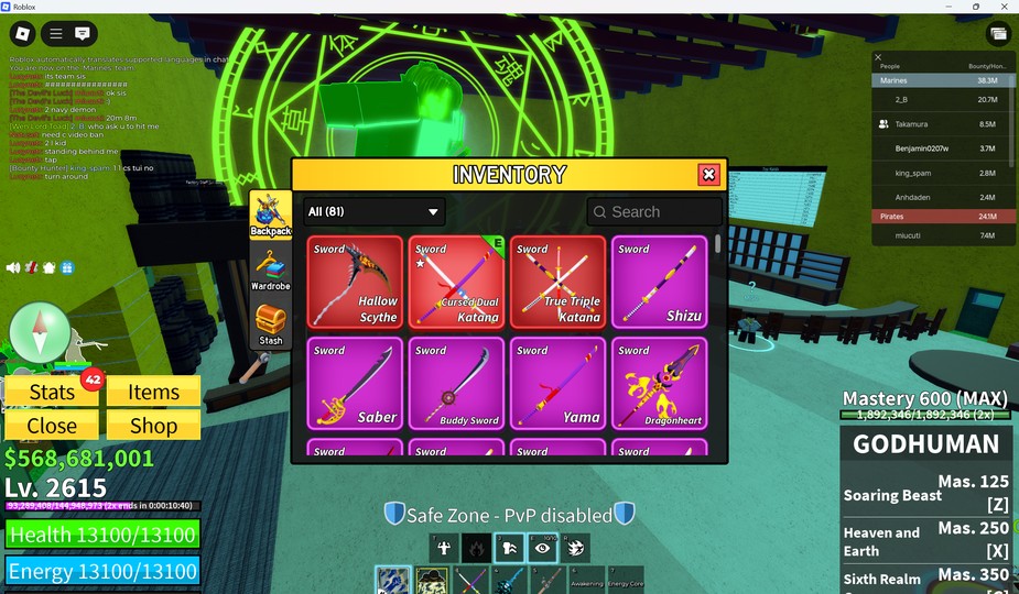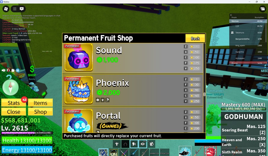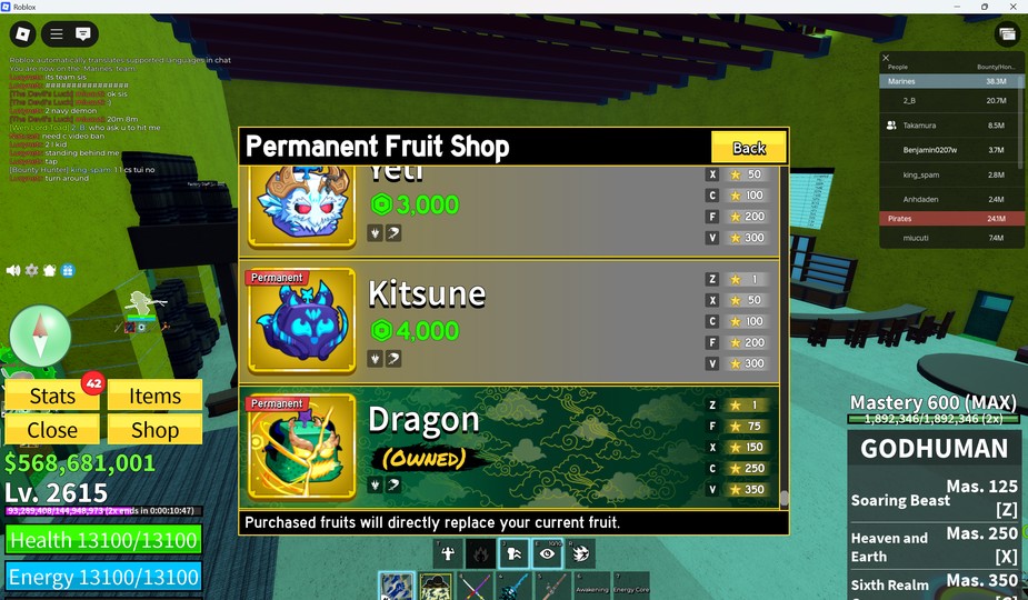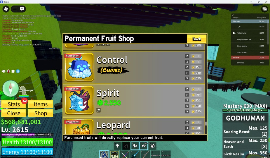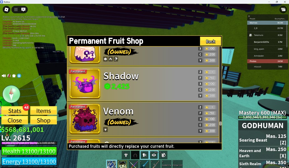 Blox Fruit: 一堆永久果(看圖) 幾乎全武器 全拳法 還有3顆利為坦心臟沒用 有雷電皮膚 5果倉 幾乎全通行證 (龍族 機器人 滿齒 天使3齒 人一齒)有破冰船 利維坦盾等頂級配飾 還有剩有些紅果 紅果以下大多都有5顆 裡面還有5億貝利 大概5萬f