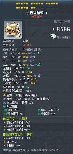 【永恆盜賊頭巾】22星-7cd6%全屬永恆盜賊頭巾 白4全b~