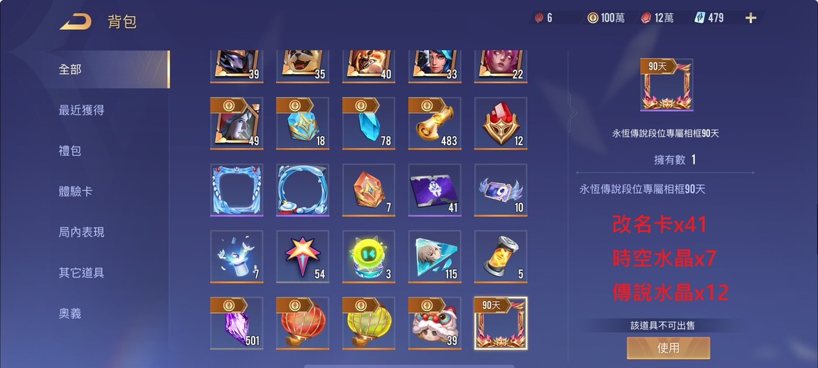 📌金幣百萬、傳說水晶12、時空水晶7、改名卡41