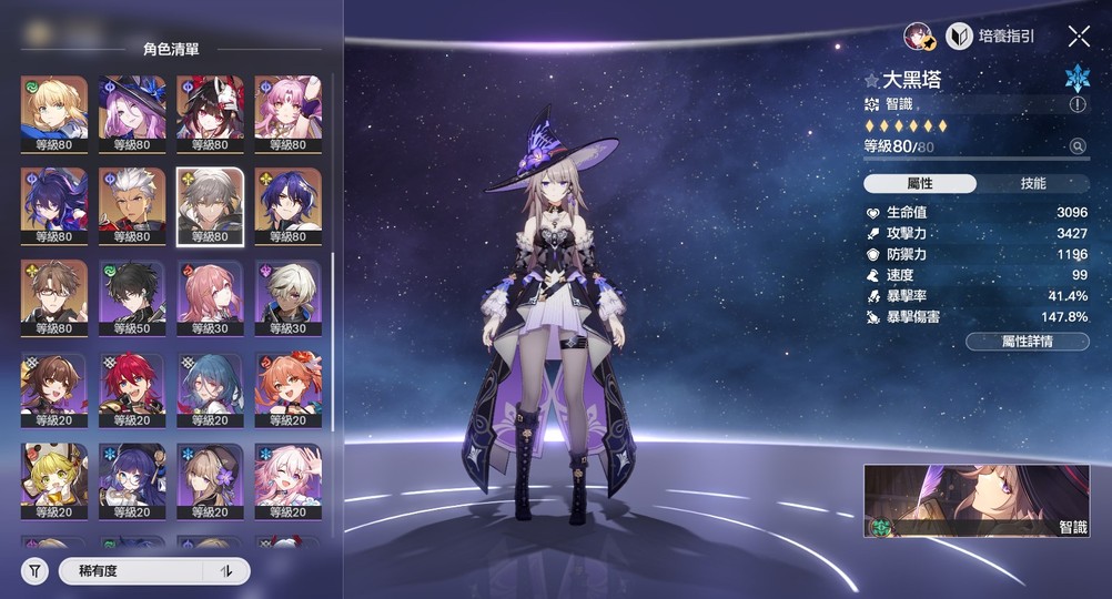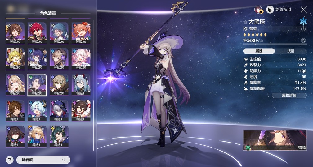 大黑塔、羅剎、遐蝶、丹恆・飲月、海瑟音、知更鳥、克拉拉、流螢、托帕&帳帳、姬子、鏡流、彥卿、傑帕德、阿格萊雅、黃泉、白露、卡芙卡、黑天鵝、藿藿、布洛妮婭、Saber、翡翠、花火、符玄、希兒、Archer、真理醫生、瓦爾特