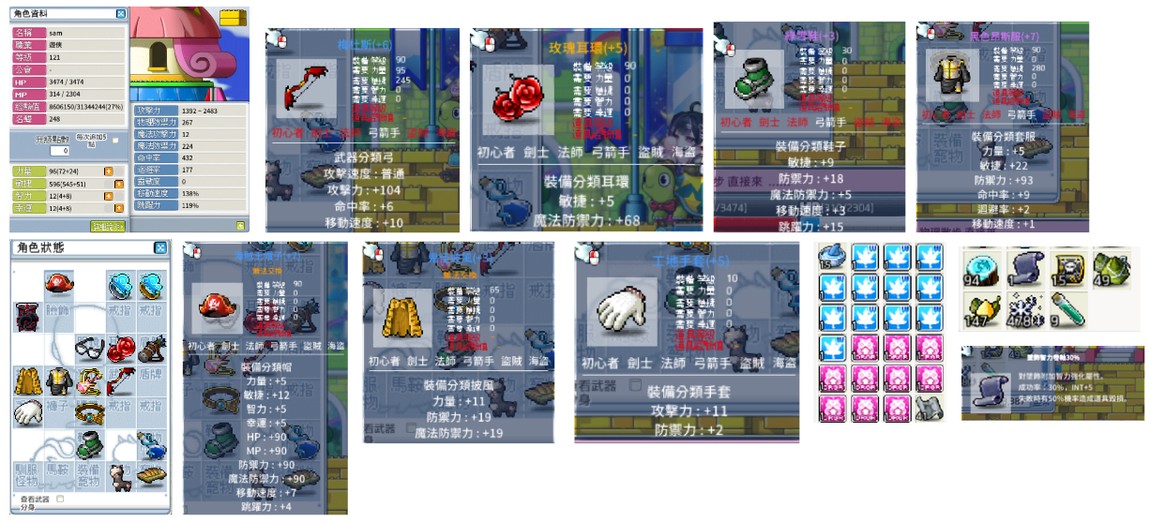 121等遊俠 梅杜斯+6 104AD 10移速 金勾帽100%+7敏 鬼怪披風+3 11力 套服27屬套服5力22敏1移速 玫瑰耳環+5敏 雪鞋+3 9敏3移速15跳躍 鋼鐵箭矢 背包還有墜飾詛咒智力捲30%可以賣到500雪 背包清一清可以賣到1000雪 12張經驗加倍10張掉寶加倍 洗血已洗滿 有意者私訊