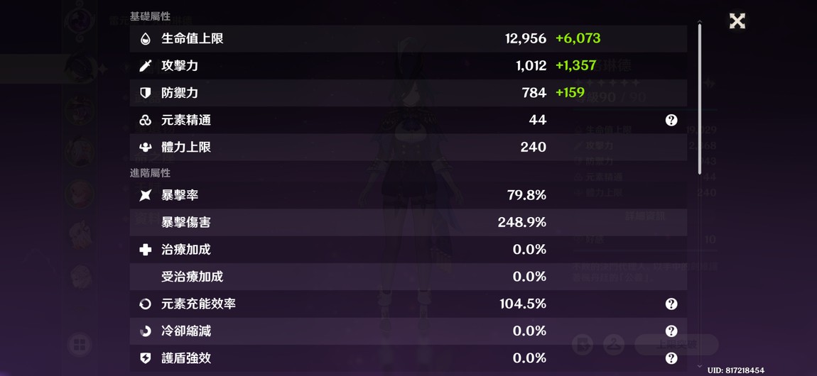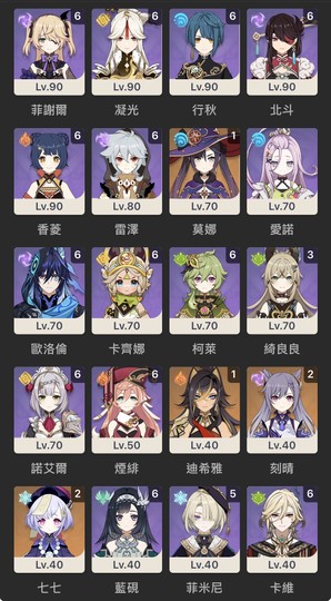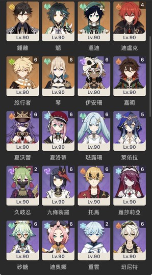 詳細有的角色、命座跟武器如圖。此帳號的角色練度可參考圖7~10 (個人是用都2+1的火神、僕人、恰斯卡與克洛琳德來給參考)。