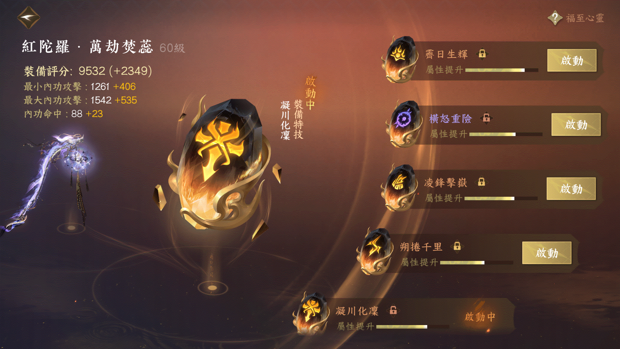 武器:凝川畫凜、霽日生輝、凌鋒擊嶽、朔捲千里、疾刃折風、(紫嗜骨+(紫)橫怒