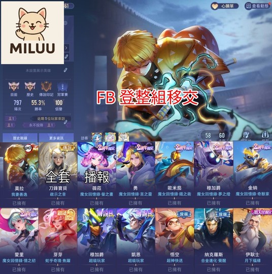 【FB帳綁信箱、星耀、V1、58英、60造】莫拉我妻善意 💥超值鬼滅簡帳💥