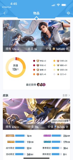 【30等】騰訊超核玩家v11無雙貴族積分70萬(624皮膚16典藏1小兵vip星會員15)