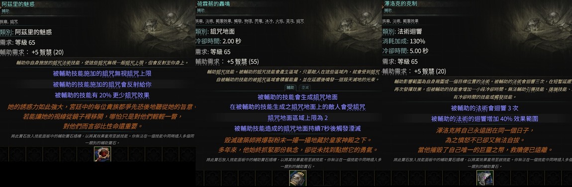 【輔助寶石】族裔→阿茲里的魅惑(詛咒無上限)荷霖蔡的轟鳴(觸發湮滅)澤洛克的克制(法術迴響)