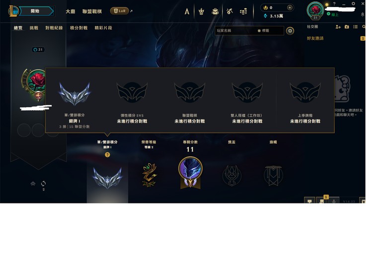 編號10.本季單雙白金,上季單雙白金,勝率81%,藍粉3萬,英雄32個,造型9個,全可改