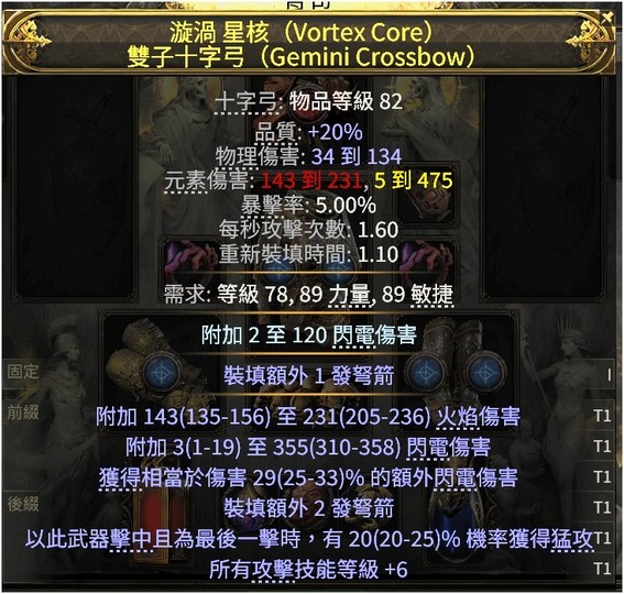 【十字弓、畢業雙子十字弓】雙頂T1電火傷、額外傷、額外裝填兩發弩箭(ilv82詞)、猛攻、技能等級