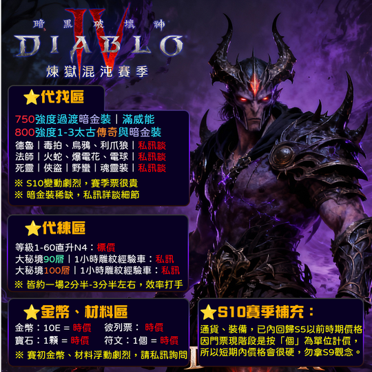 S10 賽季初期暗金、太古裝備稀缺,價格不會像 S6-S9 時期那樣便宜。