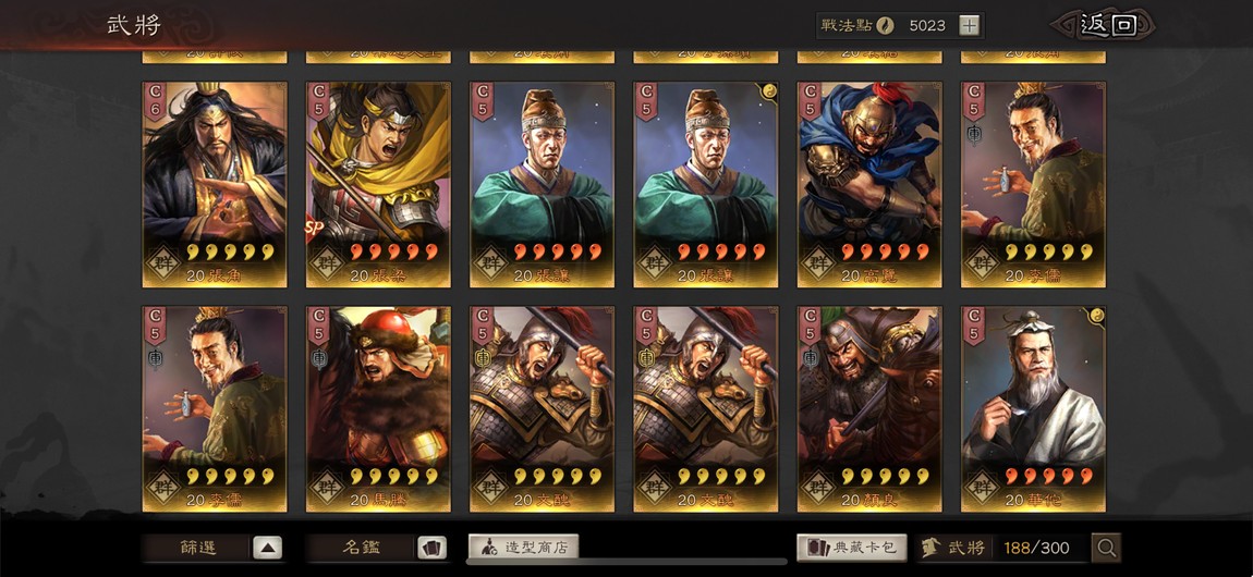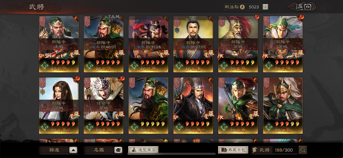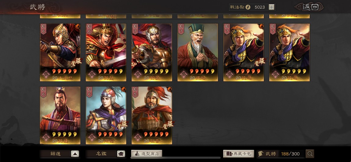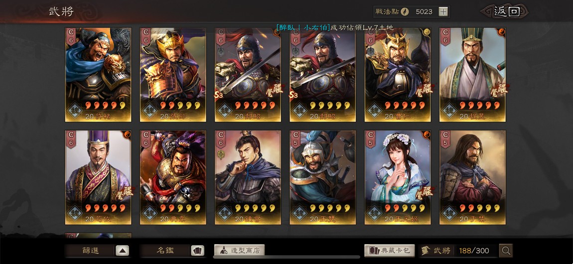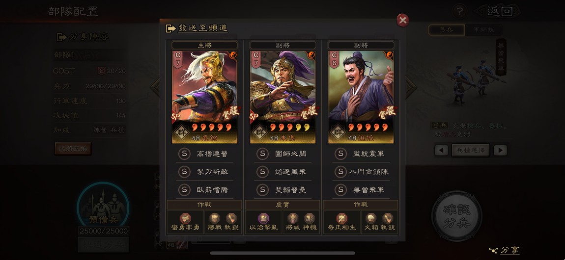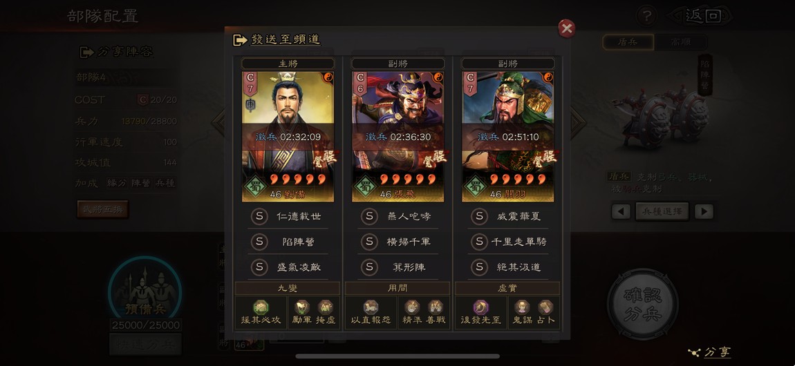 重要裝備:奸雄*1、長健*1、無雙*1、武聖*2、雄烈*1、出奇*1、踩踏*2、昭烈*1、疾馳*2、援助*3、靈動*6、號令*1