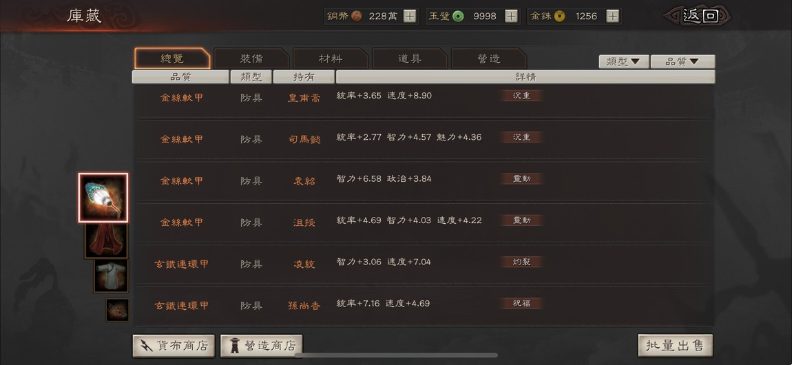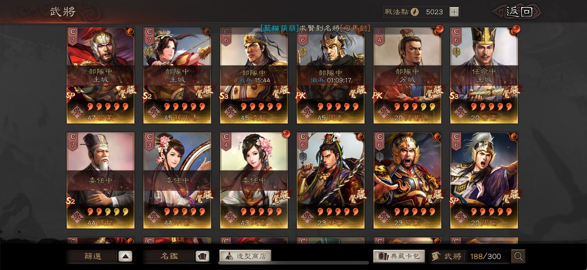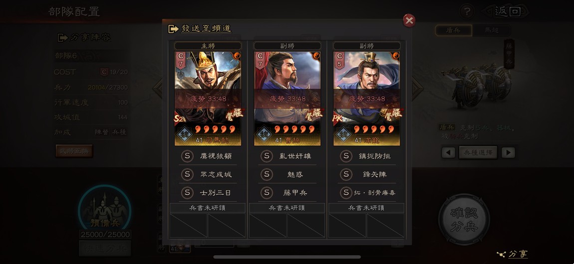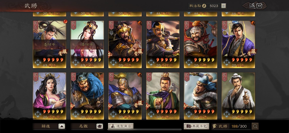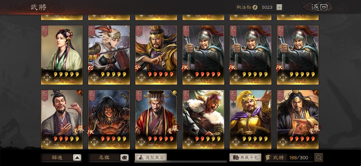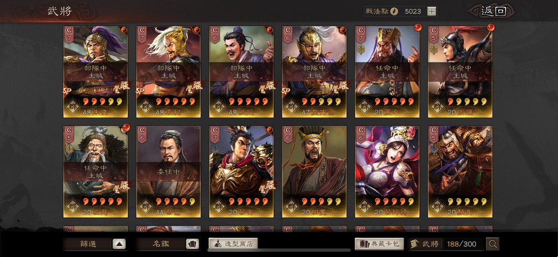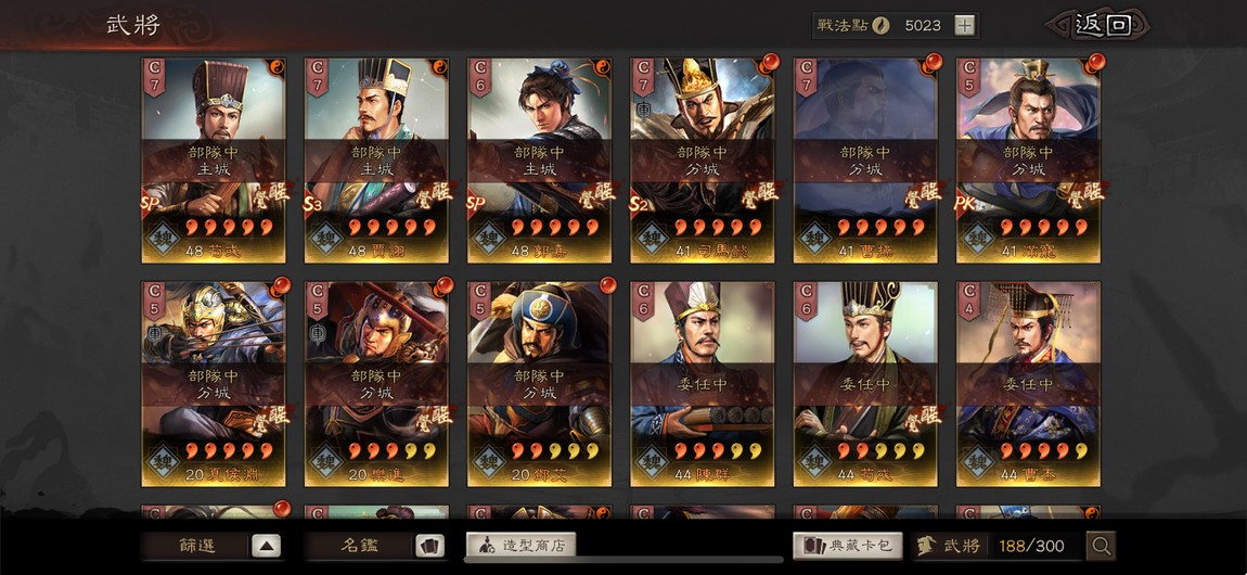 重要裝備:奸雄*1、長健*1、無雙*1、武聖*2、雄烈*1、出奇*1、踩踏*2、昭烈*1、疾馳*2、援助*3、靈動*6、號令*1