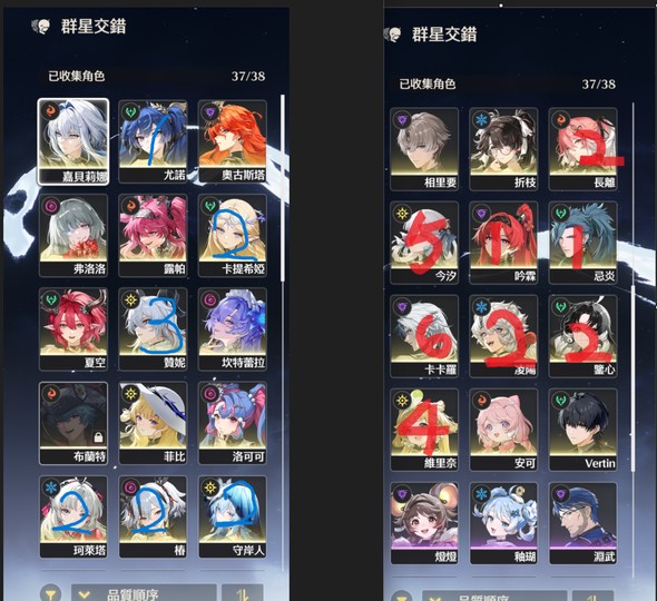 角色基本都畢業,雙爆攻%打底,大部分都有3~5有效。尤諾甚至兩顆五有效