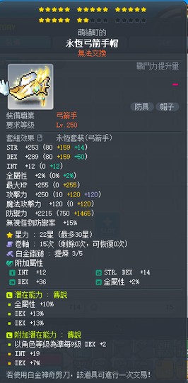 【永恆弓箭手帽】雙傳22星36%敏永恆弓箭手帽 附加大雙 白3全V捲~