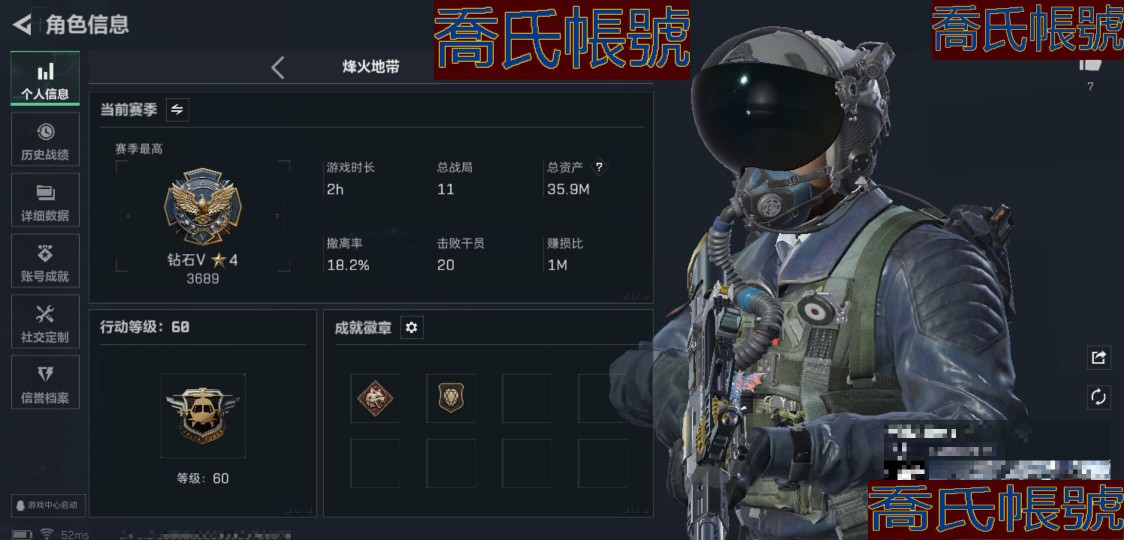 【11等】總資產:35.9M,哈夫幣:1408W,武器皮膚120,烽火60級:鑽石,戰場