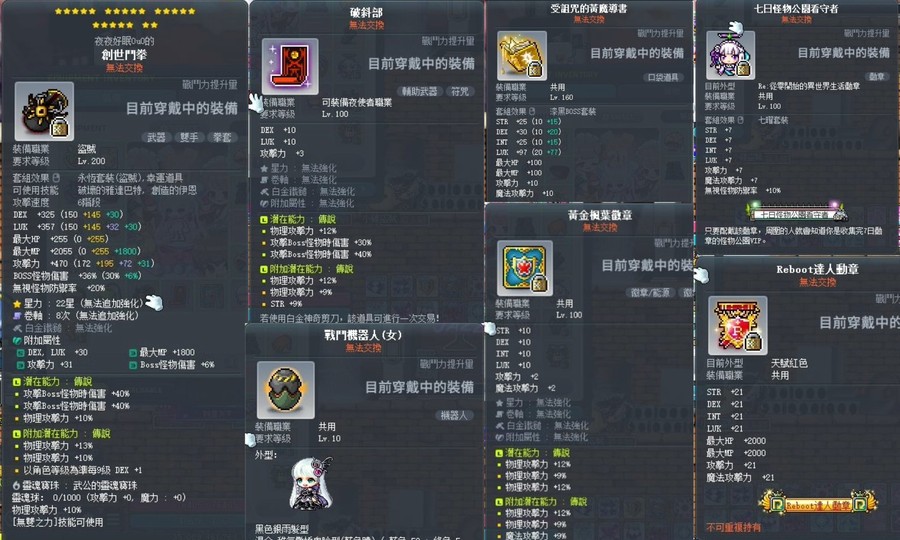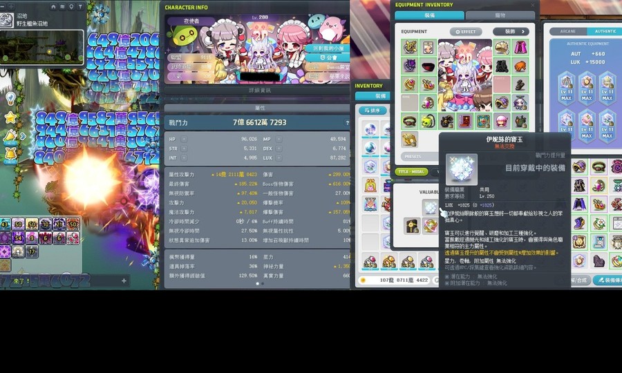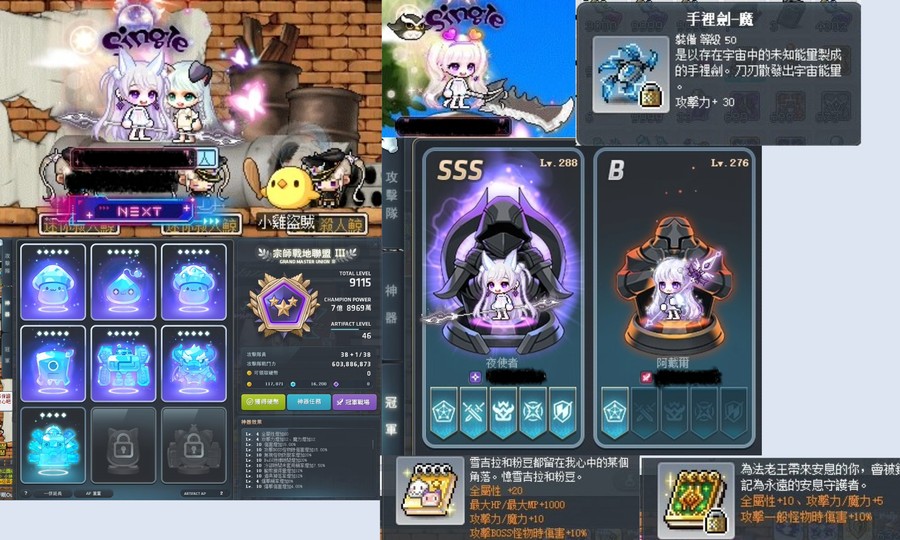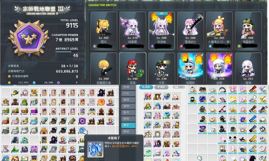 7.6億戰鬥力 288等夜使者 附加幾乎都大雙排!! 含輪迴 不拆一起賣 非高風險可儲值帳號!