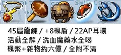45屬龍鍊+8楓盾+22AP耳環(買回去打王練功直接用,裝備當作送的不用問有啥貴裝)