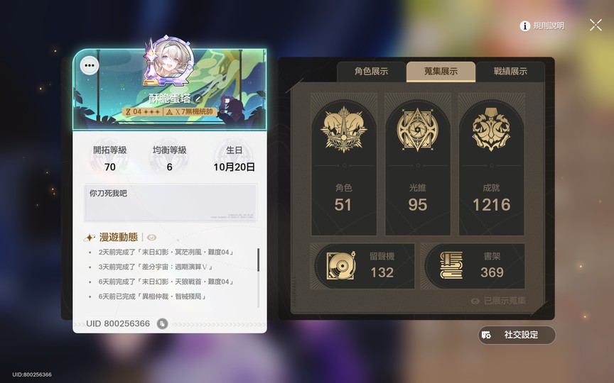 老闆也是玩家,有需求也可加好友,62霞蝶 61流螢 21風堇 21長夜月 可供支援