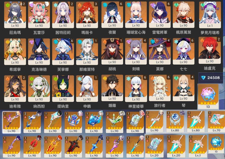 🔥五星武器跟角色如圖,帳號內還有24000創世結晶,火神也有3+1,多限定角色關鍵命座+專
