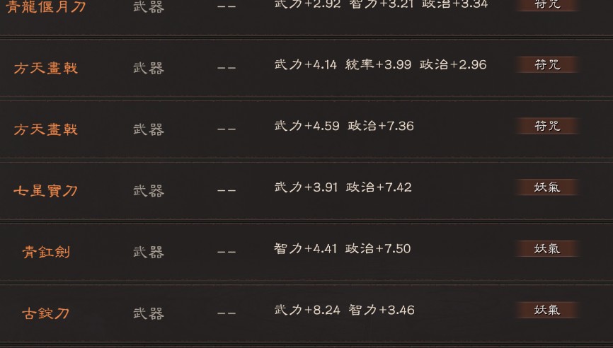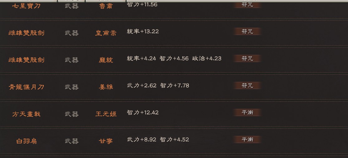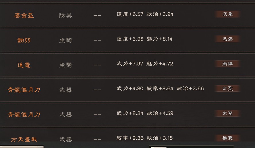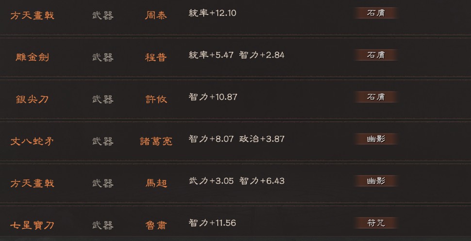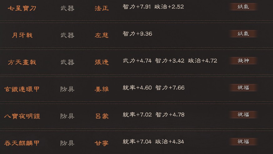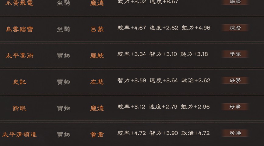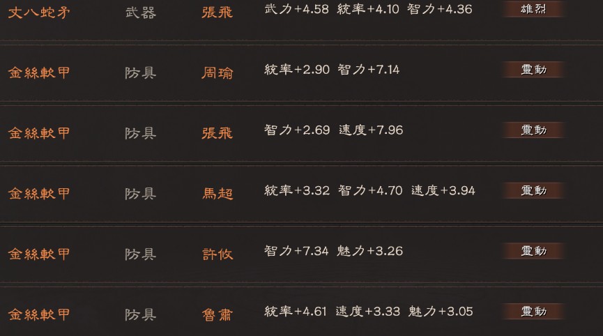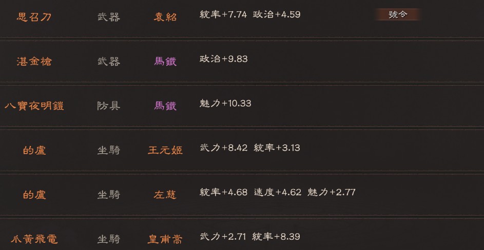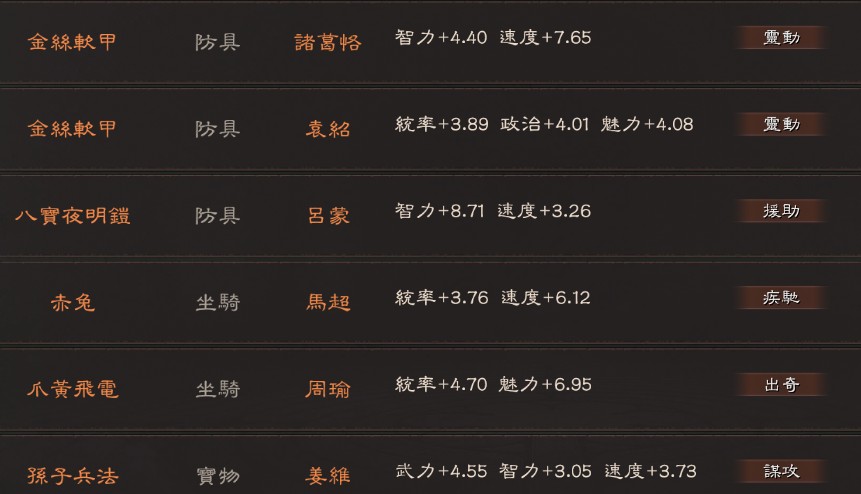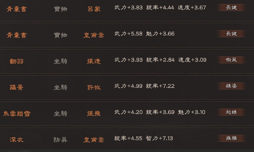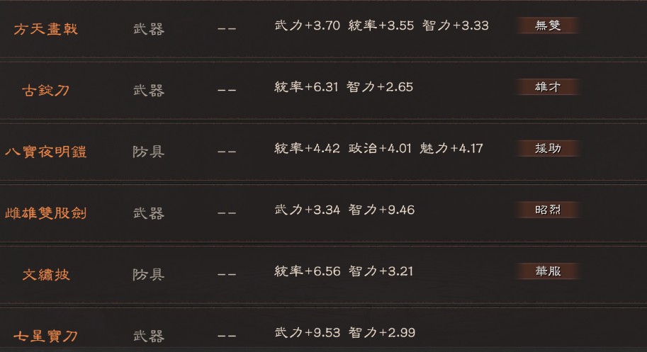 專武裝備:雄烈,華服,赳螑,號令,無雙,天公,武聖,昭烈,雄才,奇門書。。。