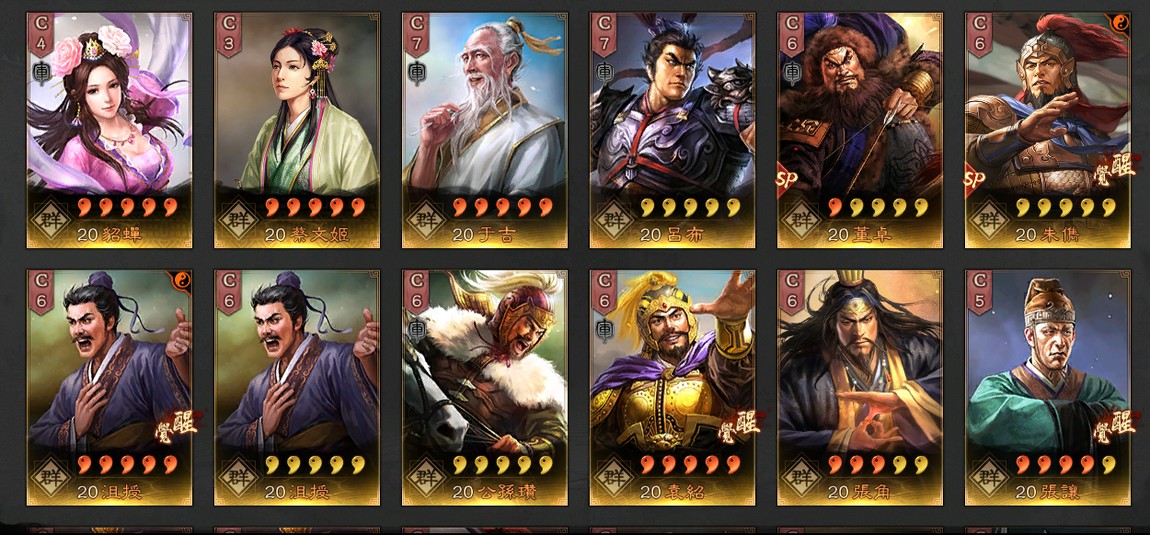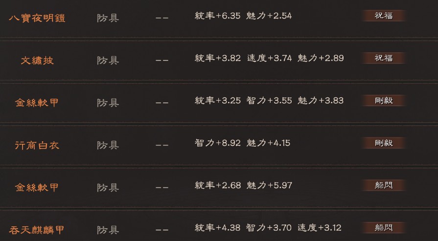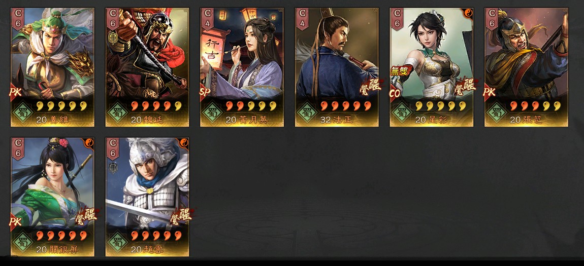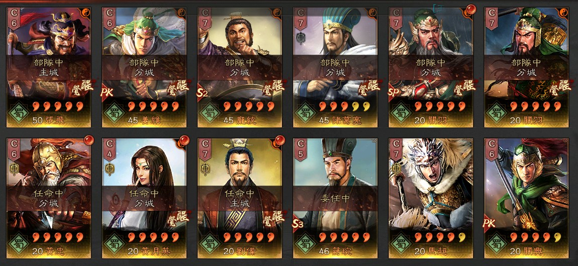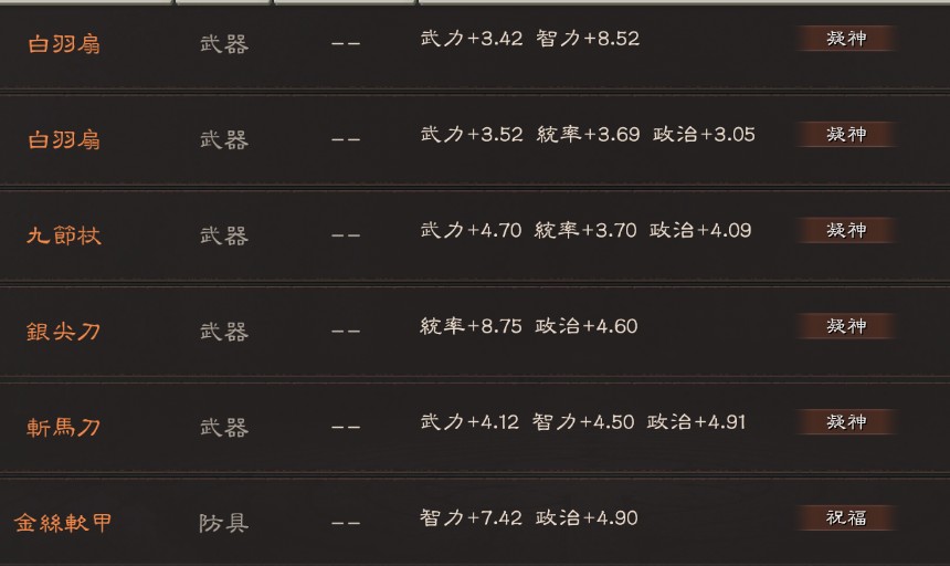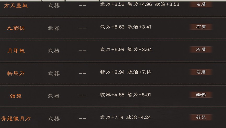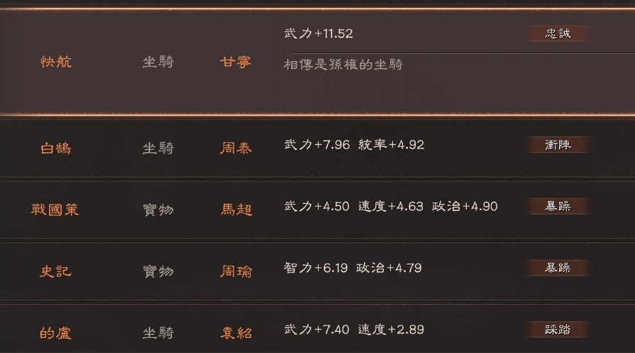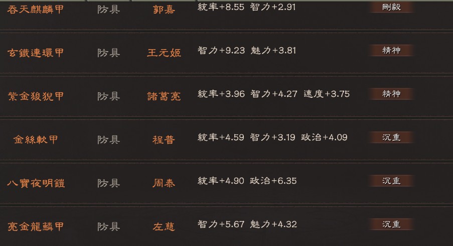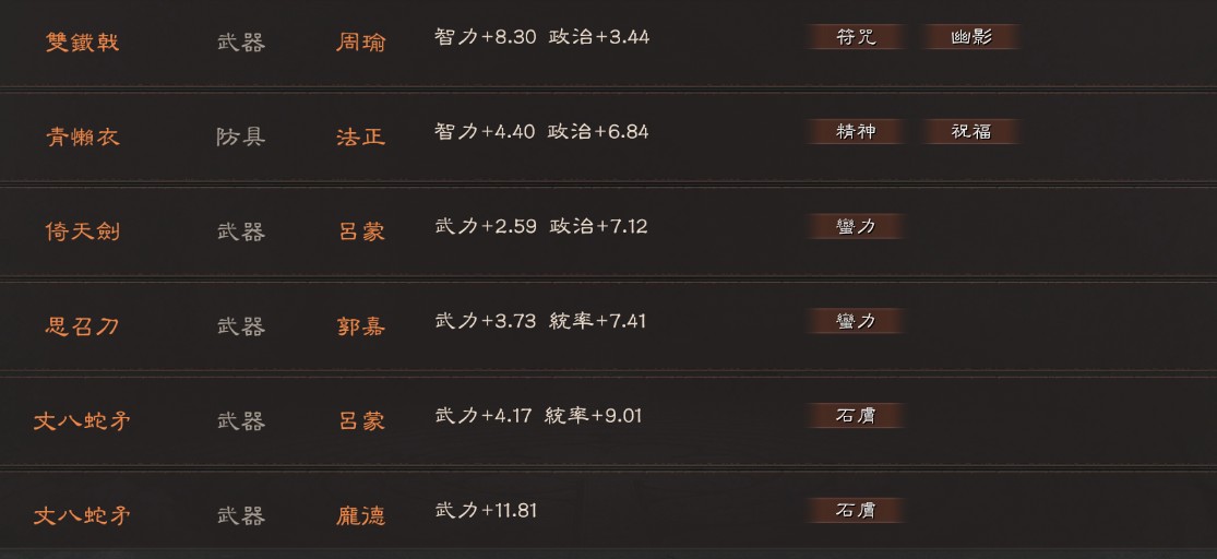 專武裝備:雄烈,華服,赳螑,號令,無雙,天公,武聖,昭烈,雄才,奇門書。。。