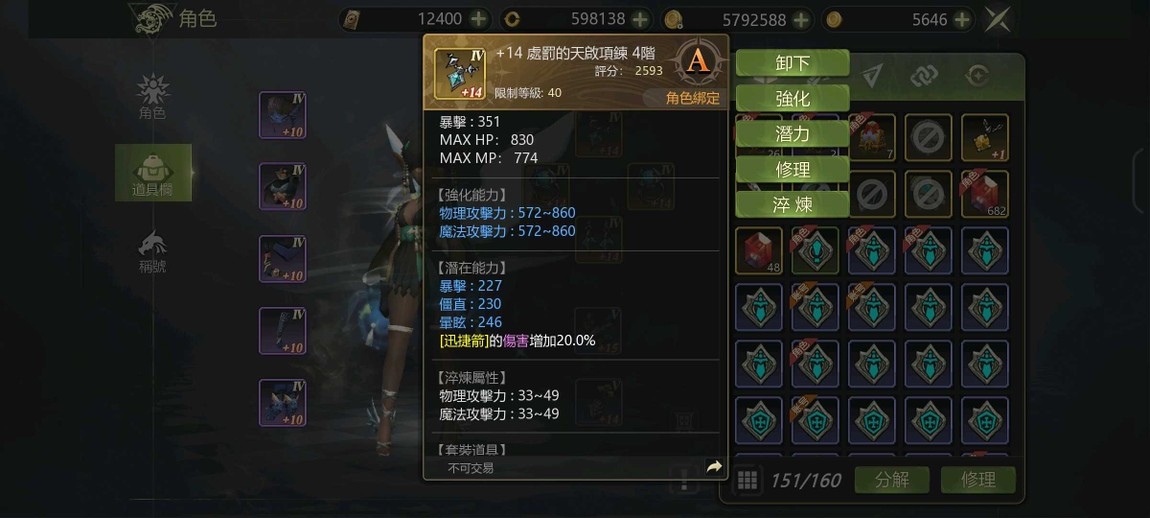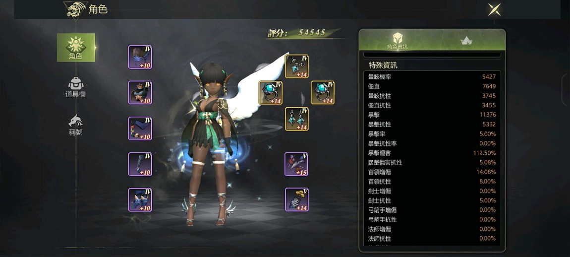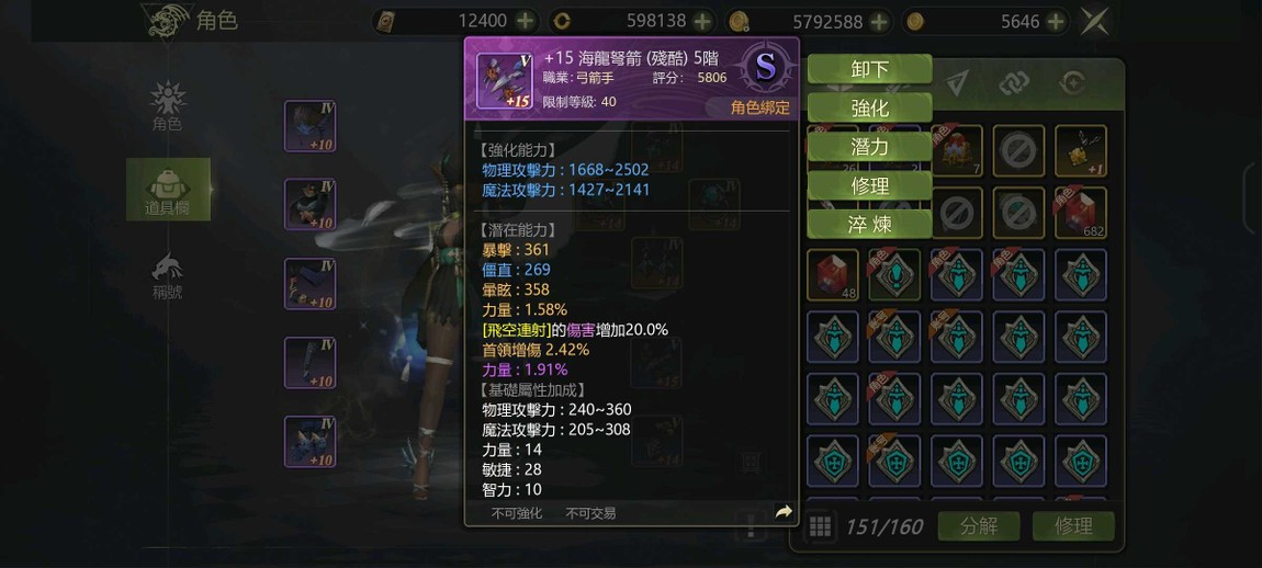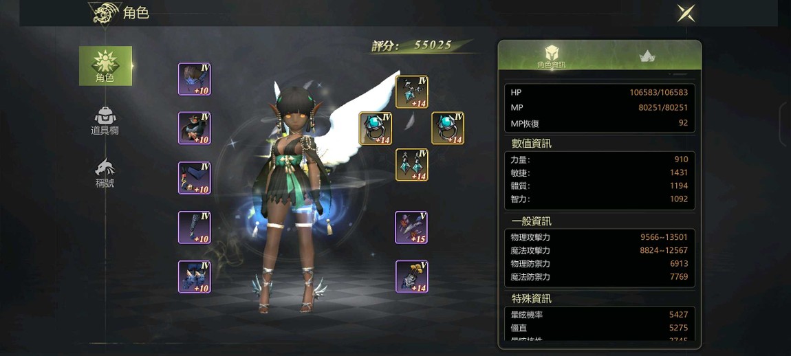箭神。物攻16090。魔攻13900 爆傷122% 迅捷120%飛空40% (可以飛空120%迅捷40%) 主副武+15潛能都7詞20%技能+首領 這東西不好洗 如果能1萬5000次以下洗到都是運氣好 還有900時裝卷2300女神卷。進圖物攻19700