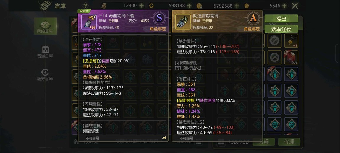 【50等】天弓物攻16386。魔攻13236 爆傷122迅捷120飛空40。物攻19700