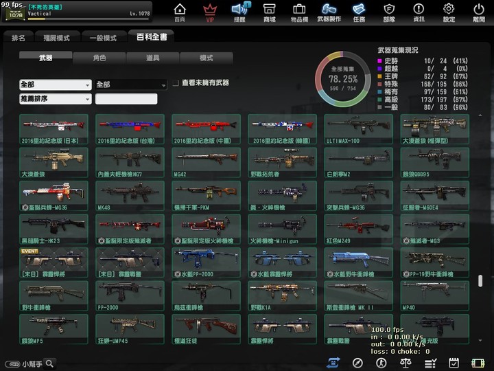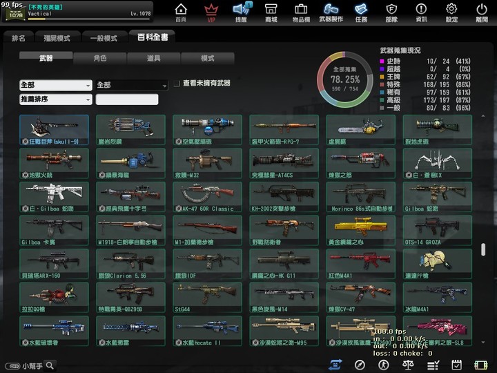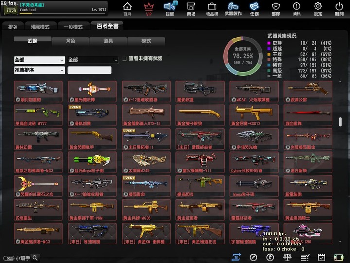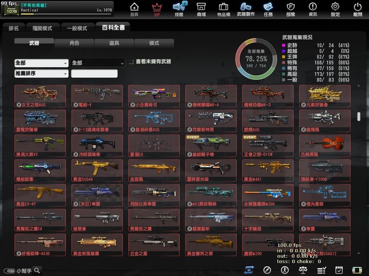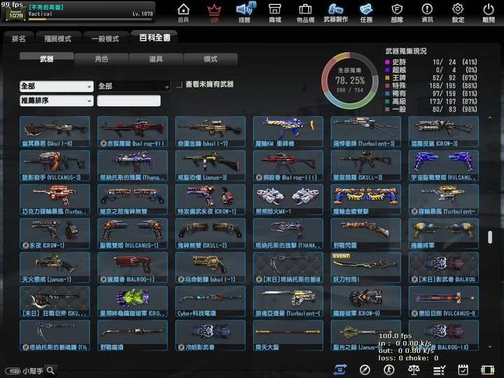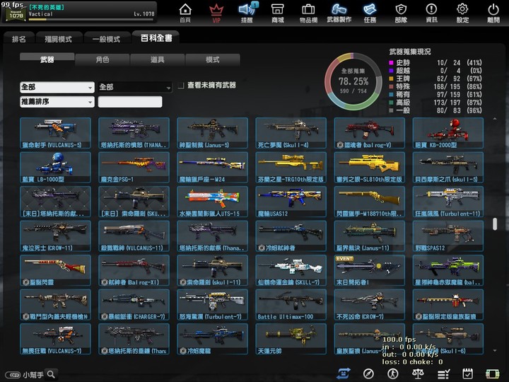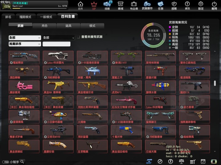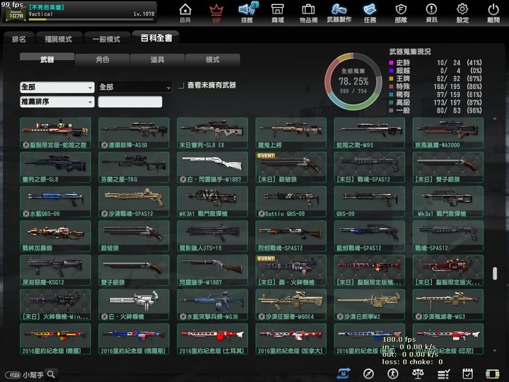 【10史詩武器、62王牌武器、59王牌角色】千等 水藍稱 雙暗影 多絕版槍枝 78% 人物92%