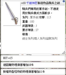+10騎兵之劍 HIT+15 遠距離傷害+18% 植物11% 鐵匠製作