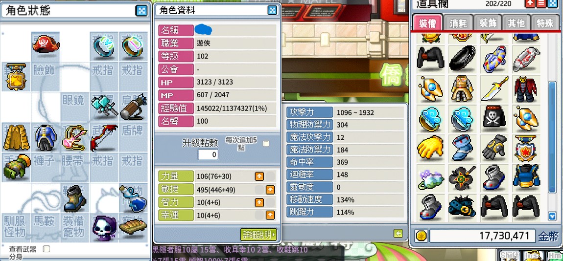 ◎特殊物品:造型券、寵物123、背包220 、粽子椅、端午勇士、拓荒者、先鋒者、小里波寵物、雪*46、順移石*6、、護身符*8、神秘背包*3