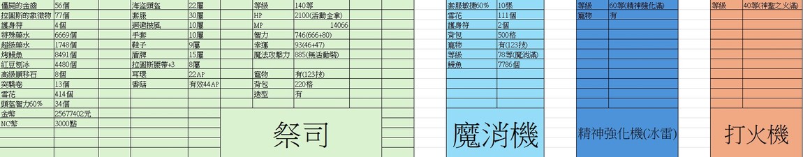 - 詳細有價裝備可看表格(身上都頂裝、還剩34張60%頭智 400雪)
