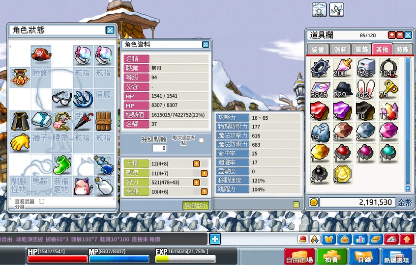 背包還有672雪跟7500W楓幣,拉圖斯象徵54個,護身符15個